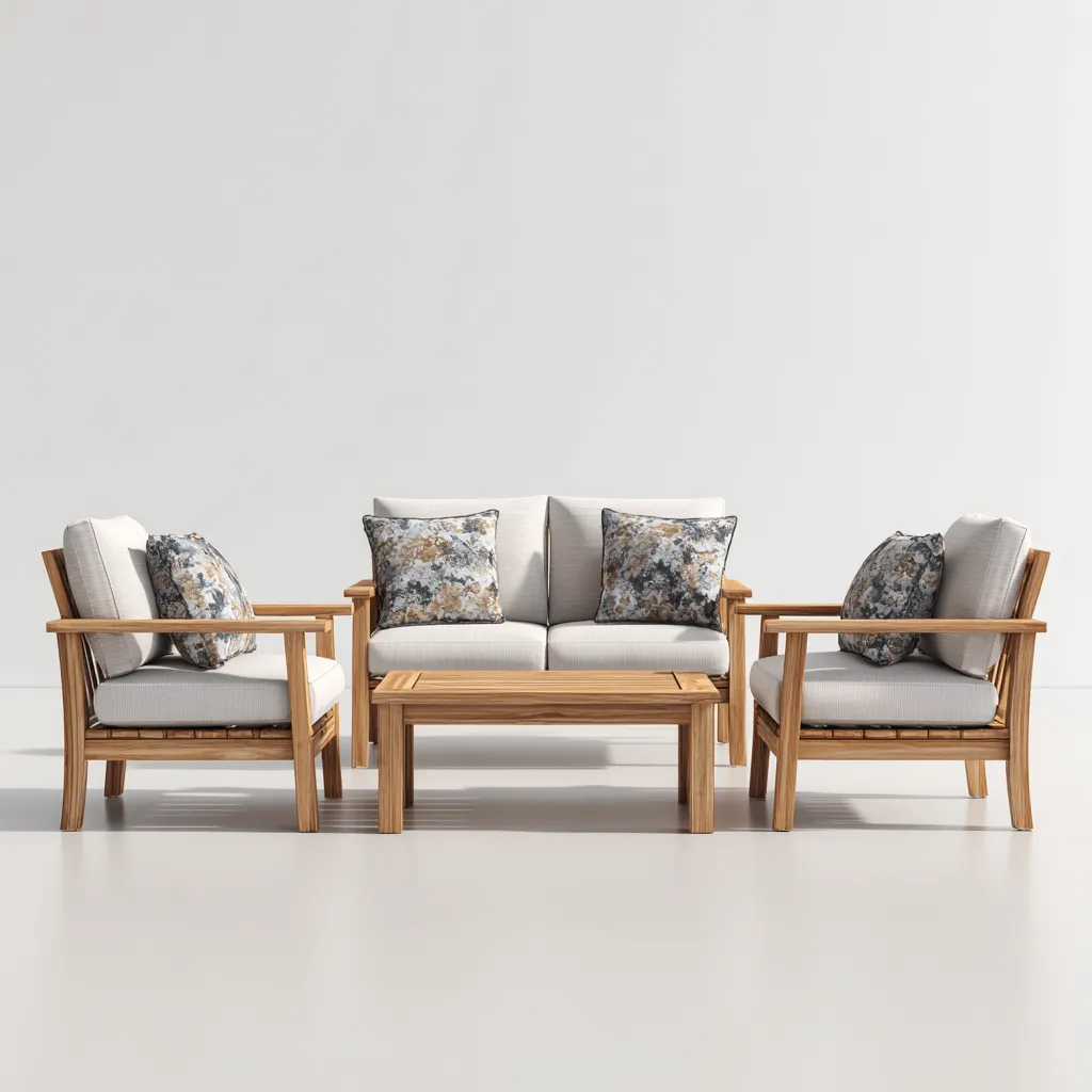 Le sedute offrono un supporto stabile e una postura rilassata. Il tavolino centrale fornisce una superficie d'appoggio pratica per l'uso quotidiano. L'insieme consente una disposizione armoniosa dello spazio outdoor.