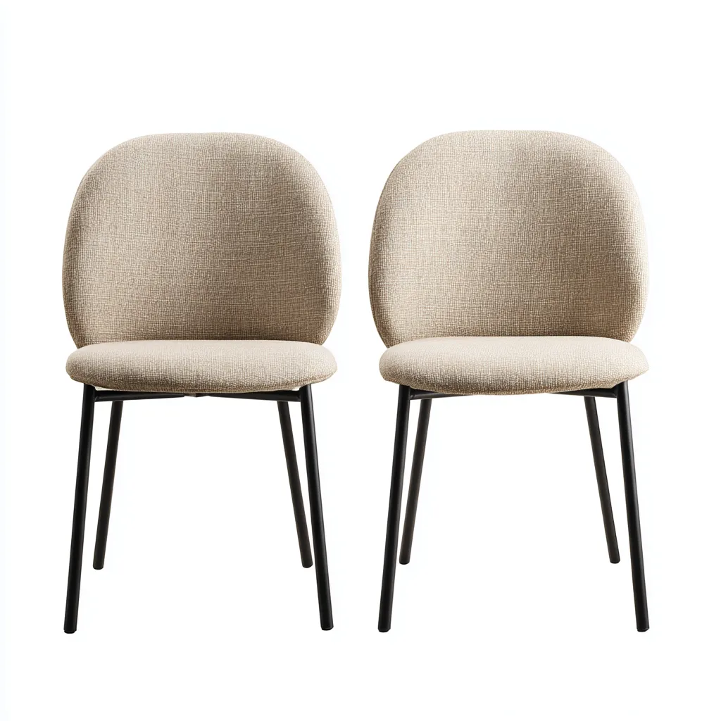 La seduta e lo schienale sono rivestiti in tessuto di colore beige, mentre la struttura portante è realizzata in metallo di colore nero. I materiali selezionati assicurano stabilità strutturale e una superficie piacevole al tatto.