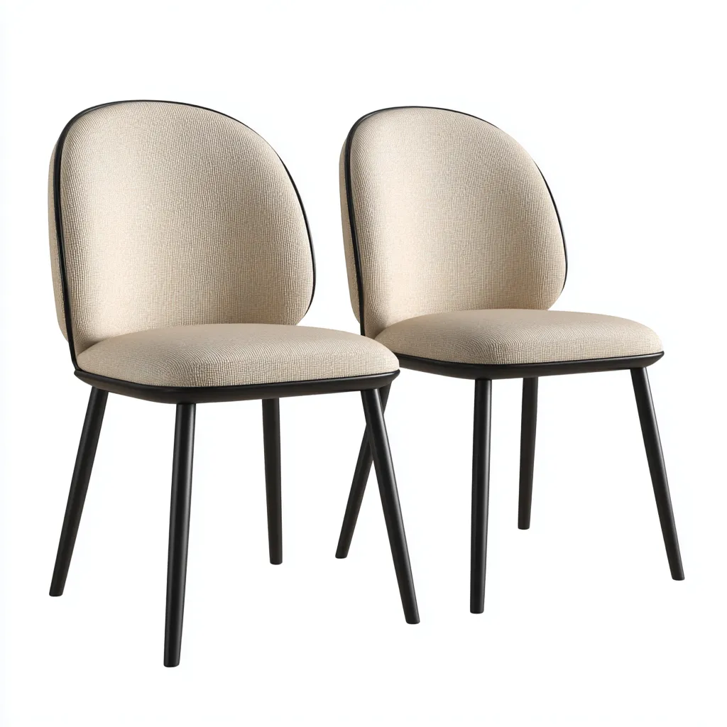 La seduta e lo schienale sono rivestiti in tessuto di colore beige, mentre la struttura di supporto è realizzata in metallo di colore nero. La combinazione dei materiali garantisce stabilità e una resa estetica equilibrata.